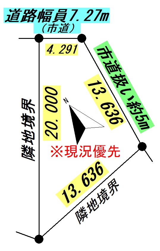 地積状況 | 平坦 北東側が幅員7.27mの公道に間口4.291m、 南東側が幅員約5mの市道扱いに間口13.636m接している |