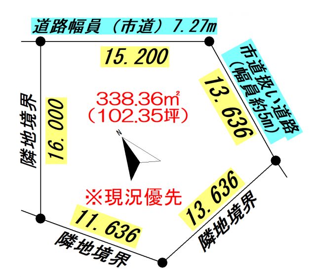 地積状況 | 平坦 北東側が幅員7.27mの公道に間口15.200m接している 南東側が幅員約5mの市道扱いに間口13.636m接している |