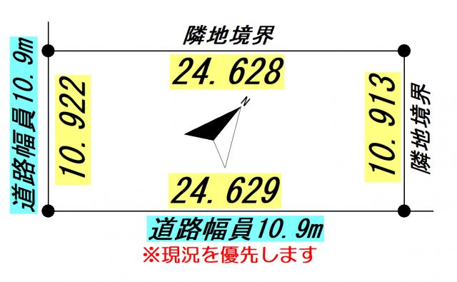 | 地積状況 | 平坦 南西側が幅員10.9mの公道に間口10.922m接している 南東側が幅員10.9mの公道に間口24.629m接している |