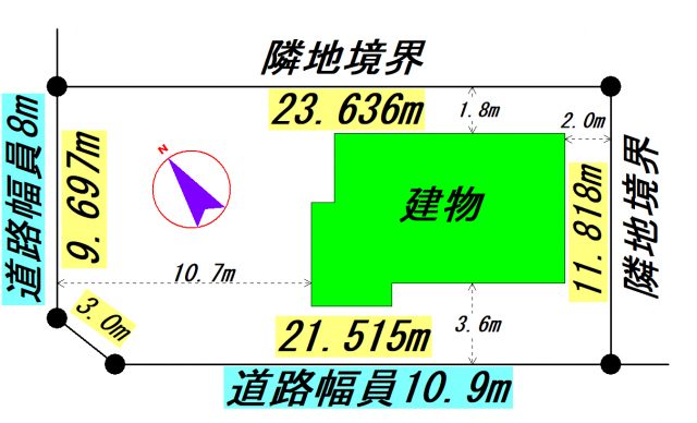 | 地積状況 | 平坦 南西側が幅員10.9mの公道に間口21.515m接している 北西側が幅員8.0mの公道に間口9.697m接している |