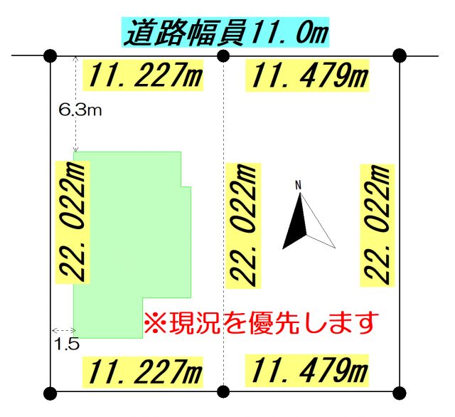 | 地積状況 | 平坦 北側が幅員11.0mの公道に間口22.706m接している |