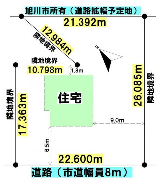 | 地積状況 | 平坦 南西側が幅員8.0mの公道に間口22.600m接している ※北西側隣接地は道路拡幅計画予定地に付き旭川市所有地 |
