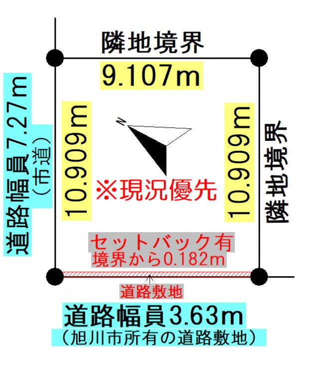 | 地積状況 | 平坦 北西側が幅員7.27mの公道に間口10.909m接している 南西側が幅員3.63mの旭川市所有道路敷地に間口9.107m接している |